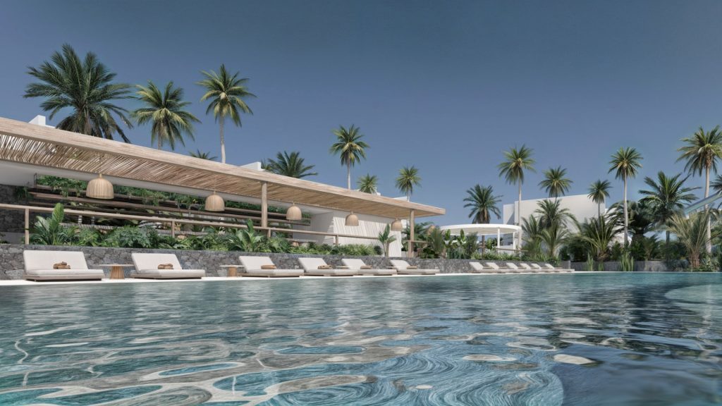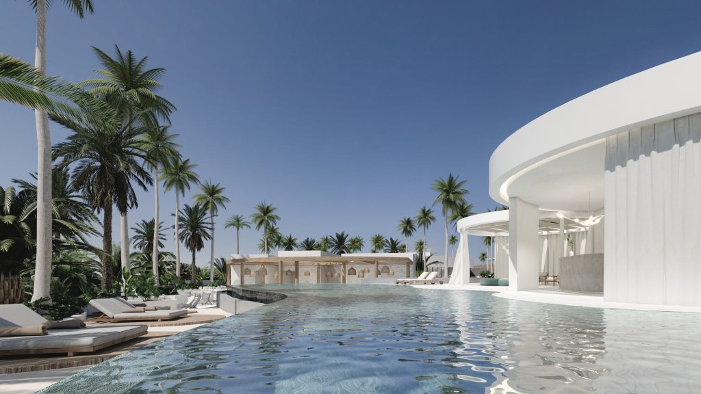 The resort’s central building stands as a true gathering point, seamlessly blending elegance and functionality. Featuring a stunning landscaped courtyard adorned with lush exotic vegetation, this space hosts a unique social club that includes a reception area, restaurant, multipurpose lounges, café, and a curated boutique.