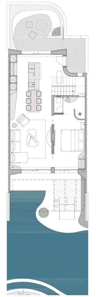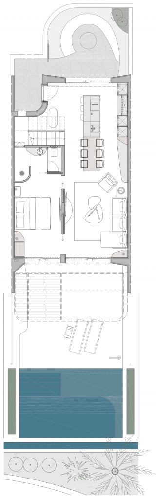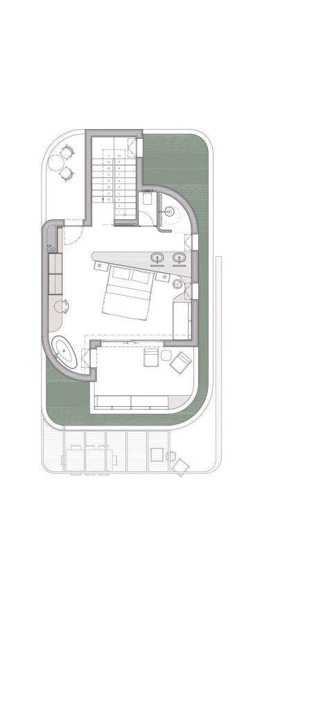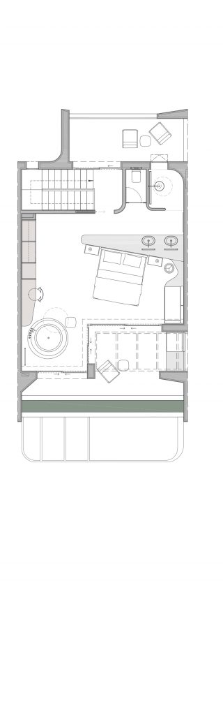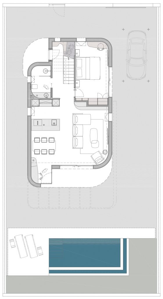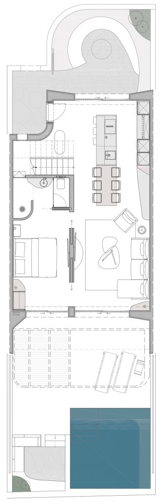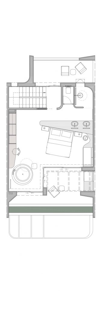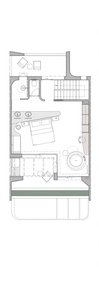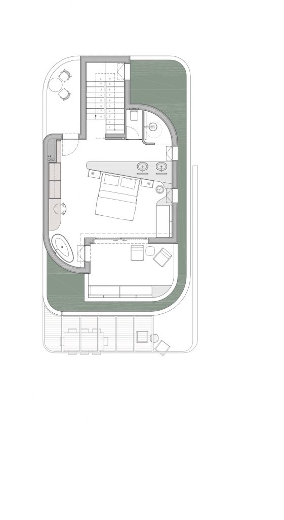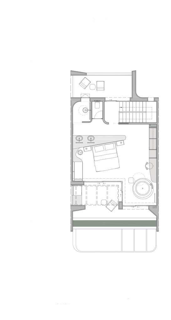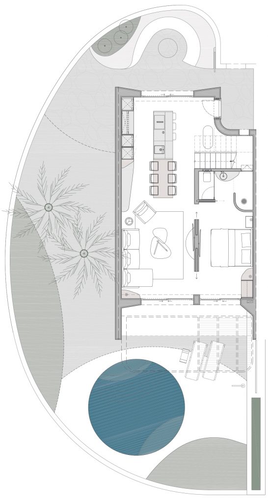 This apartment stands out from the X typology by offering a chill-out area adjacent to the pool, as well as a small private green space in front of it—depending on the specific unit—creating a cozy setting to enjoy moments of outdoor relaxation. At the rear, a courtyard completes the experience, providing a private and tranquil corner to unwind.